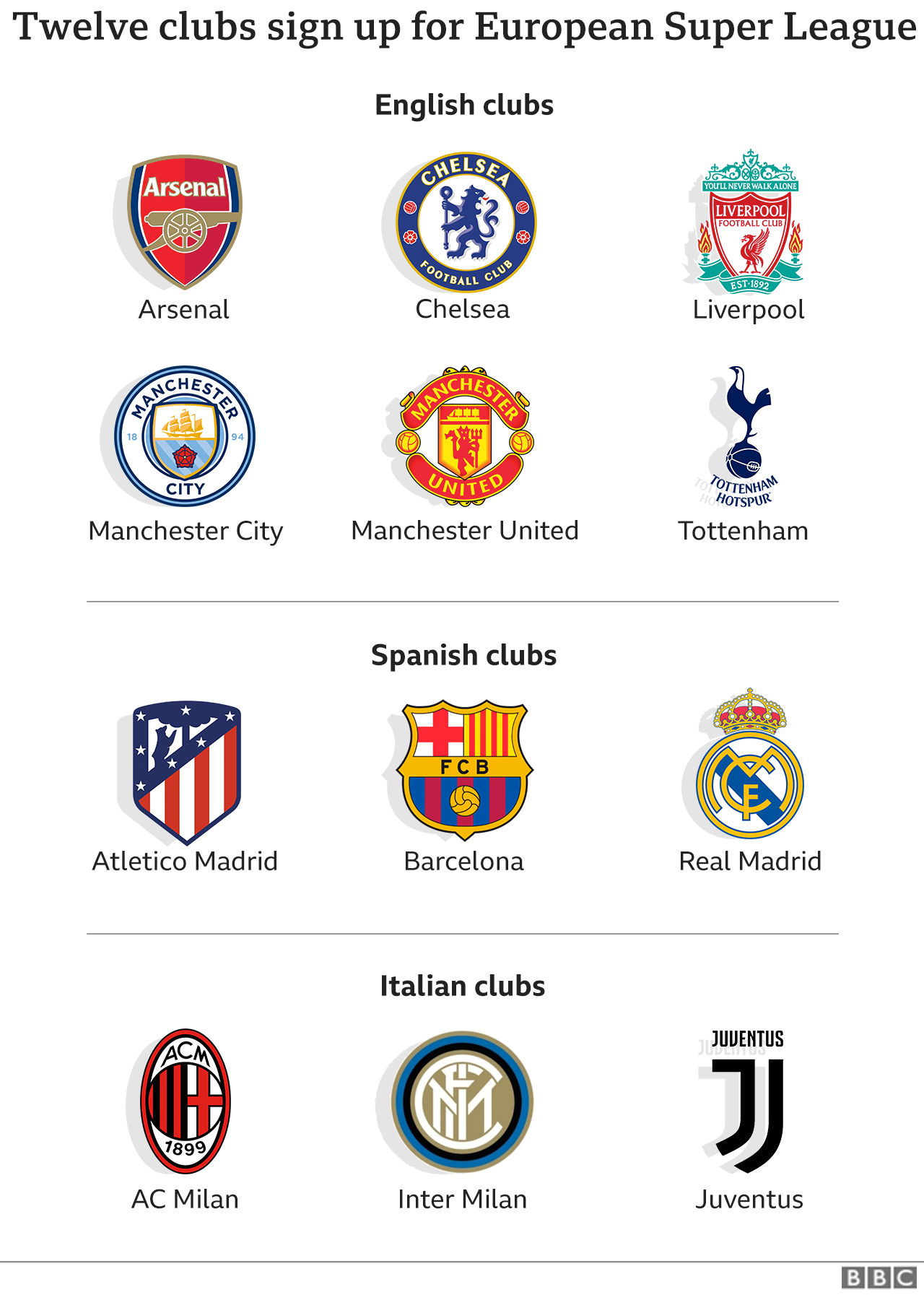 "UEFA, the English Football Association and the Premier League, the Royal Spanish Football Federation (RFEF) and LaLiga, and the Italian Football Federation (FIGC) and Lega Serie A have learned that a few English, Spanish and Italian clubs may be planning to announce their creation of a closed, so-called Super League."