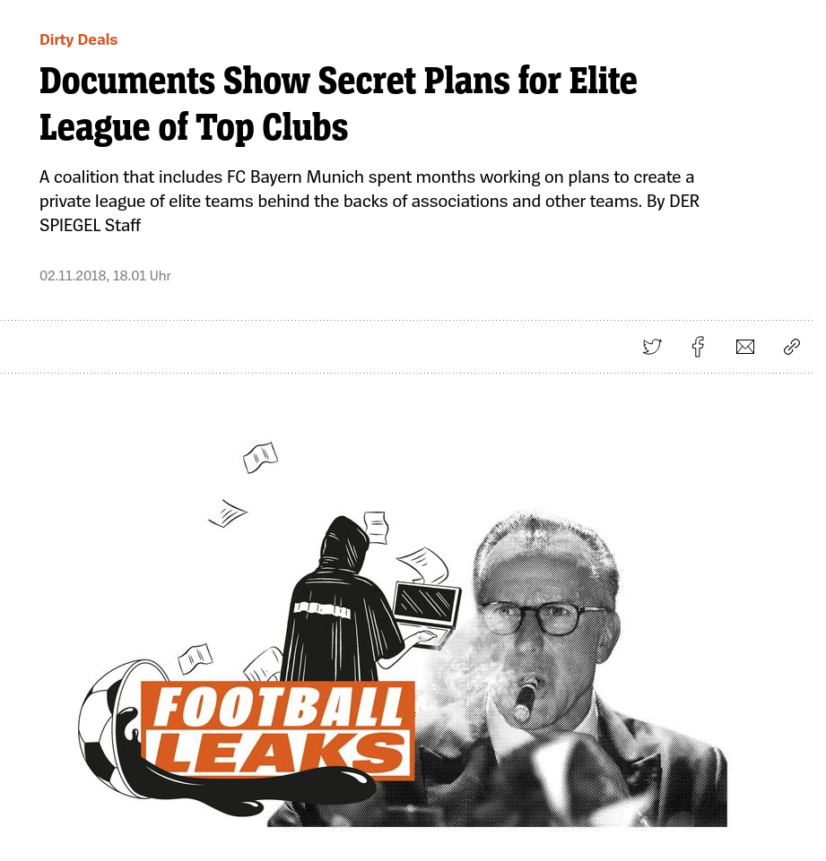 In November, 2018, the German publication Der Spiegel leaked explosive reports of secret talks between top European Clubs, aimed at creation of the European Super League. The documents showed that the conspiring clubs were considering something far more radical than a simple replacement of the Champions League, allegedly discussing "an option for leaving the national leagues and their football associations behind entirely".